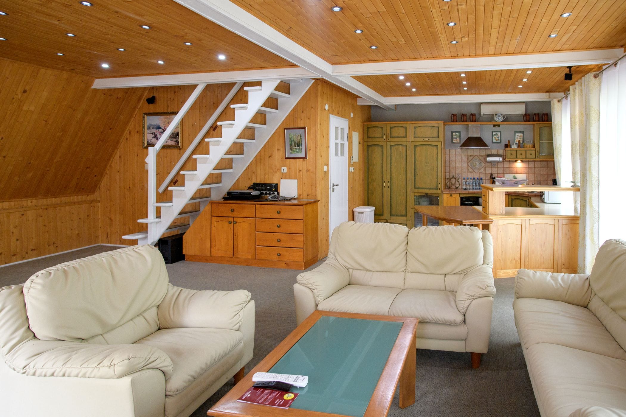 Dwukondygnacyjny domek z 3 sypialniami na piętrze, salonem z kominkiem i aneksem kuchennym oraz łazienka na parterze, główna sypialnia z łóżkiem małżeńskim, a pozostałe z łóżkami pojedynczymi. Maksymalna liczna zakwaterowania do 8 osób.